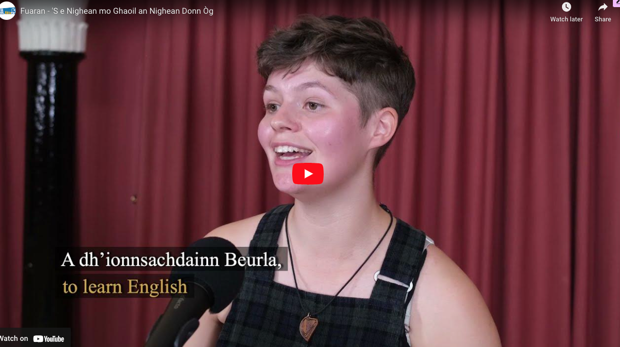 Back in 2021 I took part in Fuaran. The project was launched in 2014 and more than 70 young people aged 16-25 have taken part in training and song workshops since then, led by a host of leading Gaelic song and research experts. For my involvement I researched a song by the “Blind Minister” and Duncan Bàn MacIntyre (1724-1812). I then got the opportunity to record and film it as part of Fuaran. Here is a link to my research, and the video contains Gaelic and English subtitles which is very uncommon, but a great thing for me as a deaf Gaelic person: https://www.feisean.org/fuaran/en/songs/my-love-is-the-young-brown-haired-girl/